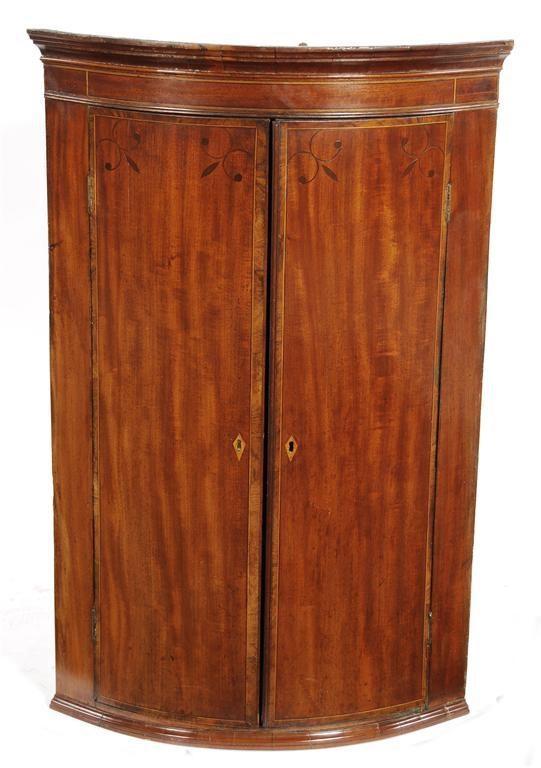 An early 19th century mahogany bowfront hanging corner cupboard