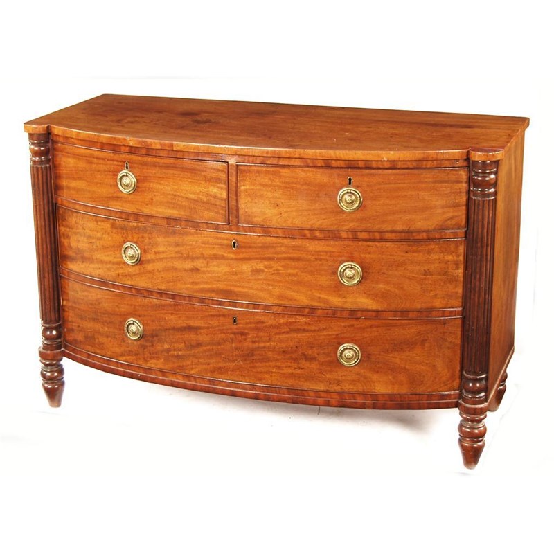 An early 19th century mahogany barrel front chest, with two short and two long graduated drawers, oak and cedar lined, fitted later circular brass plate handles, flanked by ribbed pilasters on turned feet, 32.25in (82cm) h, 50in (127cm) w, 23in (58.5cm) d. Old restoration.