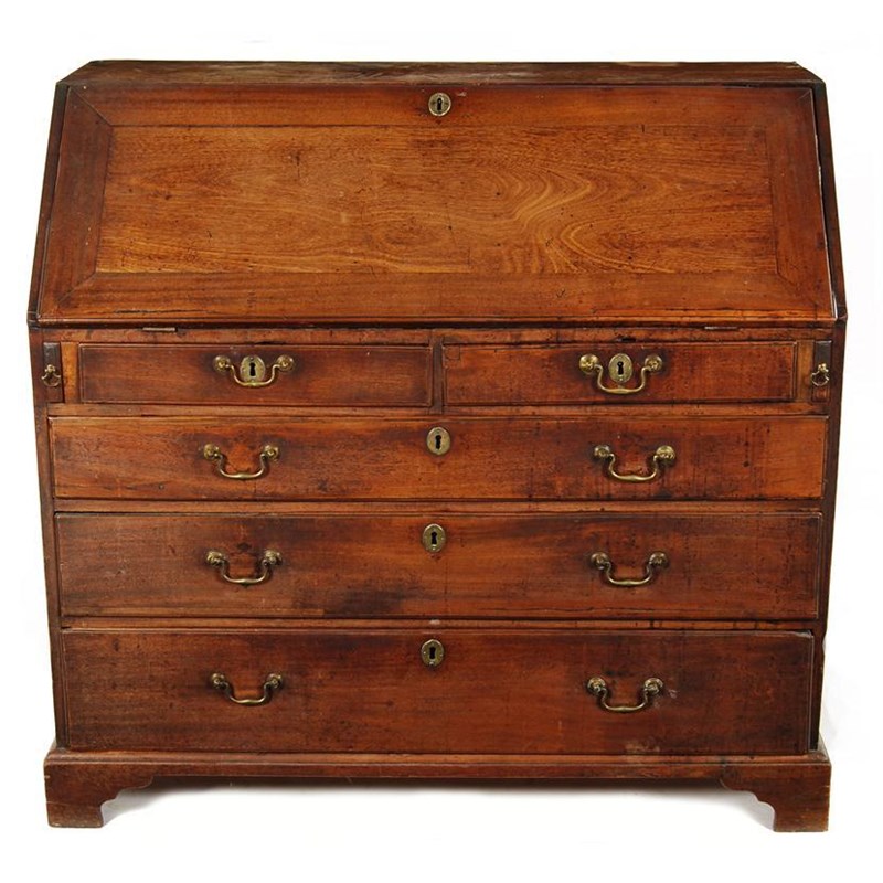 A George III mahogany bureau, with a fitted interior of a central cupboard door enclosing a drawer and pigeon holes with pull-out section, secret compartments, stop fluted pilasters flanking further shaped drawers and pigeon holes, above two short and three long graduated drawers fitted later brass swan neck handles on bracket feet, 43.5in (110.5cm) h, 47.5in (120.5cm) w, 24.5in (62cm) d.