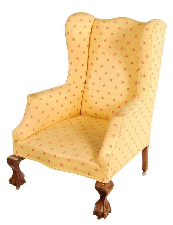 A wing armchair, with a serpentine front seat on carved cabriole legs to claw and ball feet and castors.