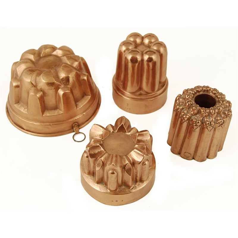 A Victorian copper jelly mould by Benham and Froud, with six ribs, stamped with orb and cross mark and '478', 5.5in (14cm) h, another of castellated form with ring fastener, 5in (12.5cm) h, hole to outer edge, a castellated example stamped '663', 4in (10cm) h, and a pipe mould stamped 'Jones Bros, 4 Down St. W.', 4.75in (12cm) h. (4)