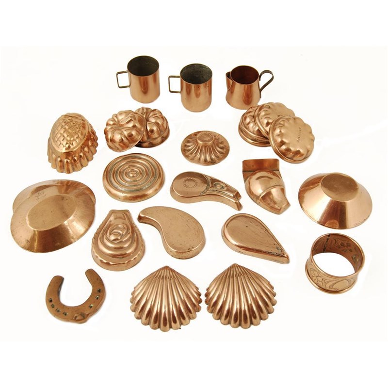 A pair of Victorian miniature moulds, of shell form, stamped 'Jones Bros Down St Rd164987', 2.5in (6.5cm) w, three melon panelled moulds, the stalks stamped 'Rd121218', four panelled moulds, stamped 'Rd190587', an oval mould of pineapple form, eleven various copper moulds, plain and patterned, a Keswick School of Industrial Art copper napkin ring, three measures and a miniature horseshoe. (26)