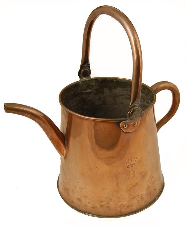 A 19th century copper watering can, of tapering cylindrical form, with loop and swing handle and a curved spout, the side engraved an Earl's coronet over 'D', 10.5in (26.6cm) h. Provenance: The Earl of Ducie, Gloucestershire.