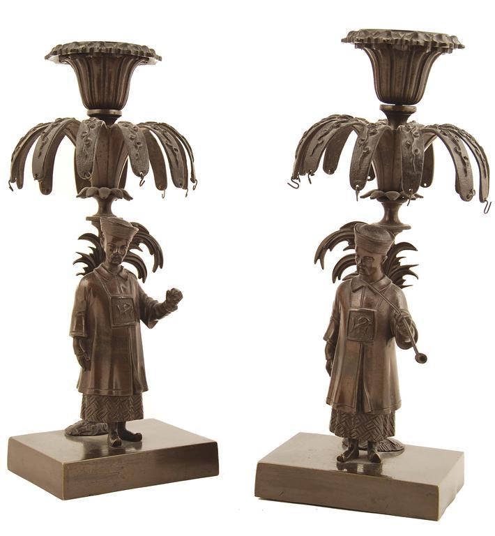 A pair of 19th century bronze figural candlesticks, raised on rectangular bases with a chinaman holding a pipe, one missing, standing under a palm tree, previously hung with lustres, to flared sconces with detachable nozzles, 11.25in (28.5cm) h. (2)