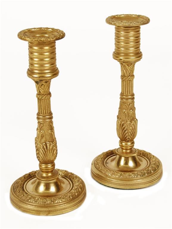 A pair of gilt brass candlesticks, in early 19th century style, having loaded circular bases with shell, leaf and tracery stems, ribbed sconces with detachable leaf nozzles, 8.5in (21.5cm) h. (2)
