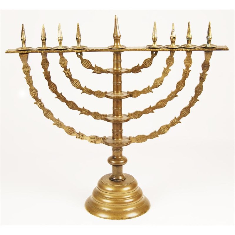 A brass menorah, with foliate branches to a ring turned column and a beaded turned domed foot, possibly 18th century, 25.5in (56.8cm) h, 24in (61cm) w.