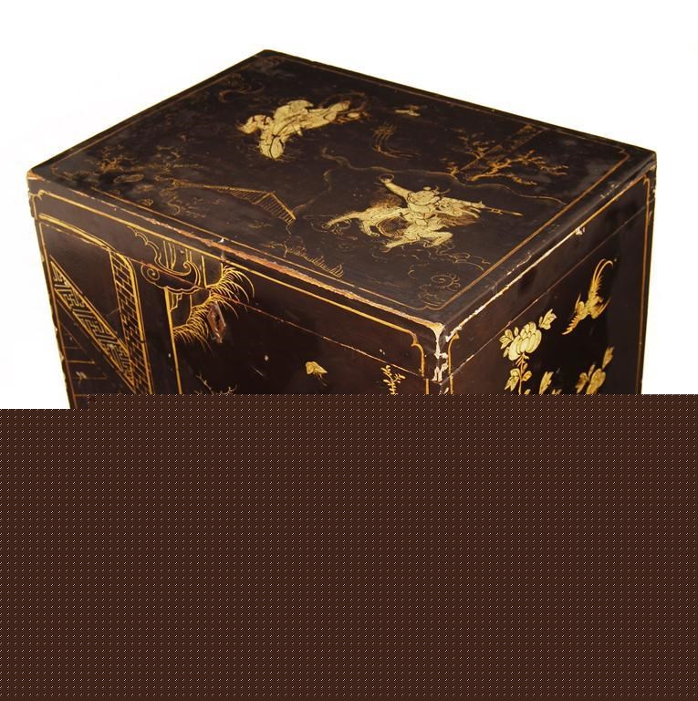 A rectangular japanned box, decorated oriental figures and foliage, with a hinged cover, 10.5in (26.5cm) h, 12.75in (32.5cm) w.