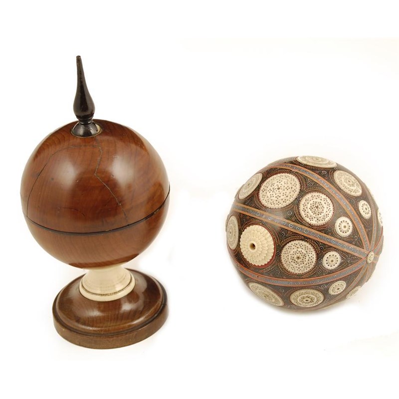 A 19th century turned yew wood stem box, of globular form with a tortoiseshell rim, ebonised finial and ivory stem, 8.5in (21.5cm) h, cover repaired, and an Indian turned wood ball box and cover with incised decoration and applied pierced ivory rondels, 4.5in (11.5cm) dia. (2)