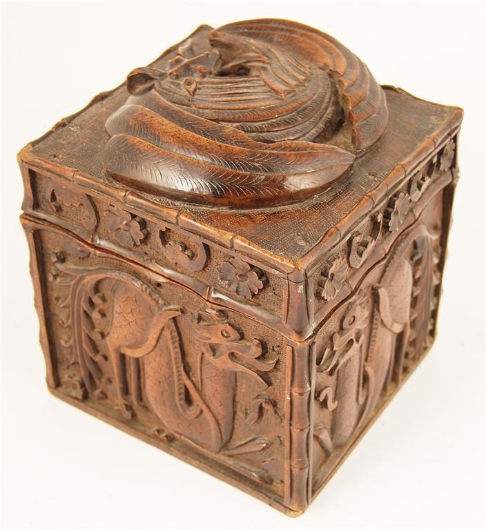 A late 19th century Anglo-Indian carved black walnut box, the hinged cover with a bat to panels of beasts and florets, 6.75in (17cm) h, 6in (15cm) w, 5.75in (14.5cm) d.