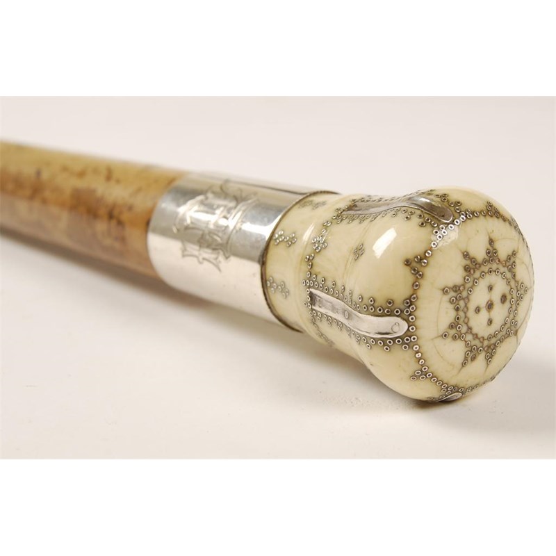 An ivory and pique work handled cane, with a star motif and channelled sides, having a silver coloured metal collar engraved a monogram on a malacca shaft, the handle early 18th century, probably reduced during the 19th century, with later rubber stopper, 33.75in (85.5cm) l.