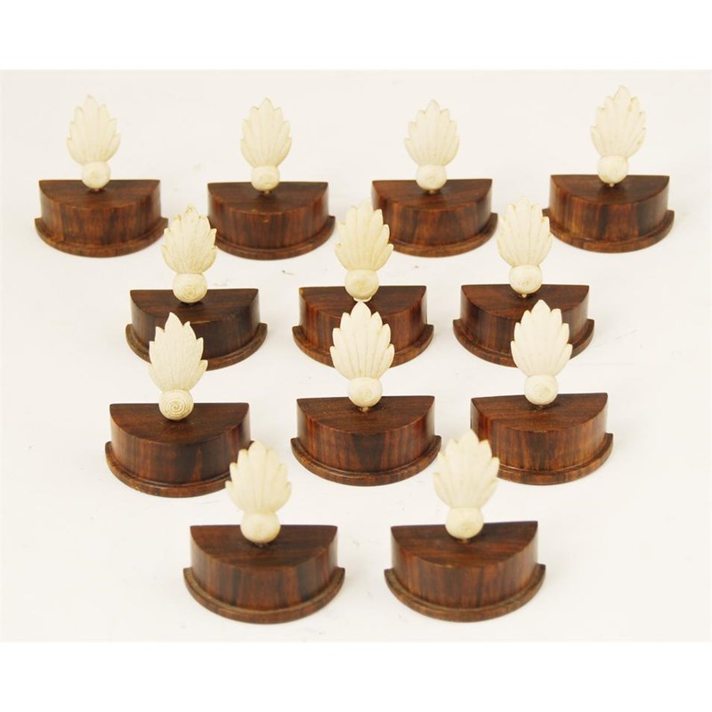 A set of twelve Anglo-Indian rosewood and ivory menu holders