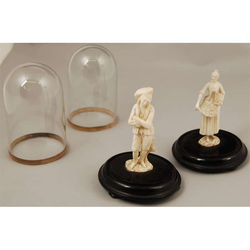 Two 19th century French carved ivory figures, of a lady flower seller and a gentleman wearing a tricorn hat, 3.25in (8cm) h, fixed to turned ebonised bases and under glass domes. (2)