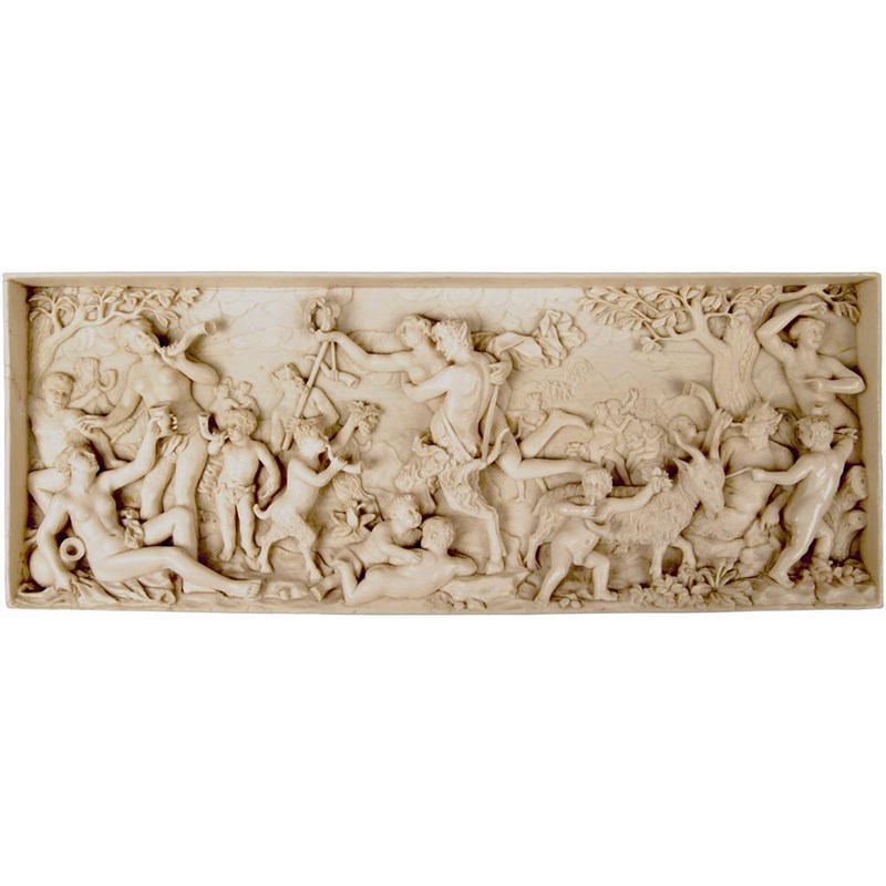 A 19th century German ivory plaque, carved in relief with fauns and maidens in Bacchanalian revelry, 3.75in (9.8cm) h, 10in (25.6cm) w.