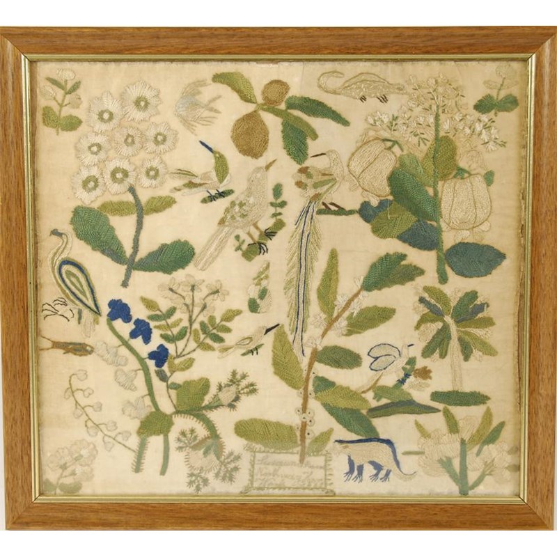 An early 19th century needlework sampler, depicting foliage, animals, fish and birds, the base with a panel 'Susanna Row Northway Her Work 1835,' 12.5 x 13.75in (32 x 35cm).
