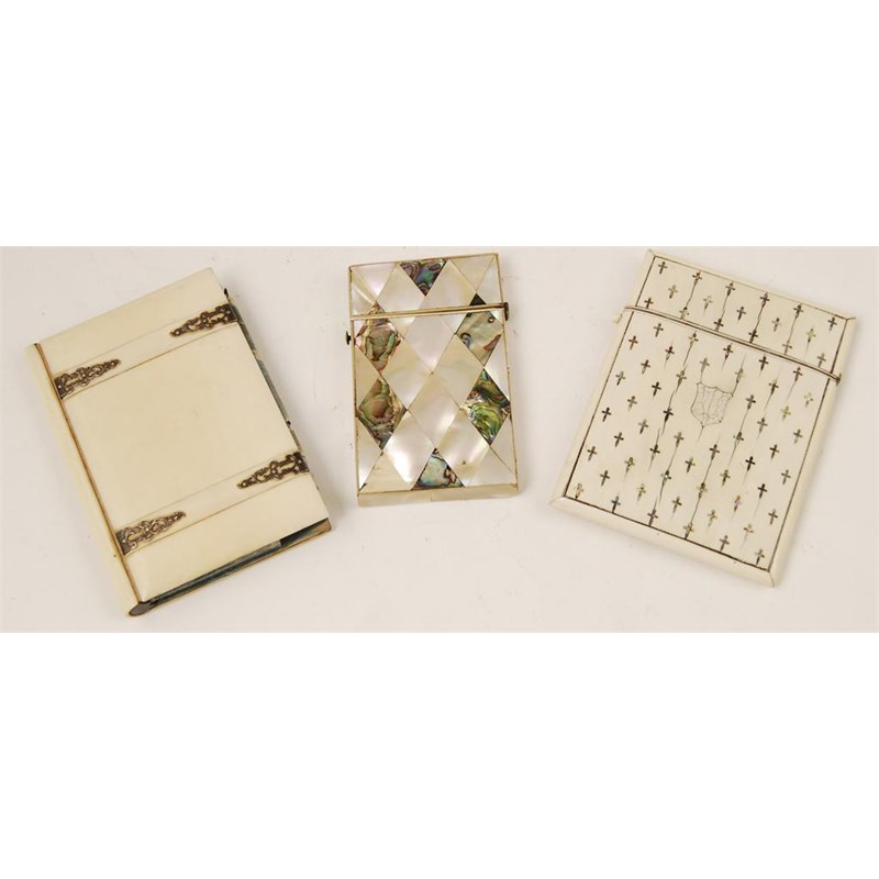 A Victorian ivory card case, inlaid abalone crosses, the front previously with inset shield having a hinged cover, cracks, 4.25in (10.5cm) h, another smaller in mother of pearl and abalone, and an ivory card book with silver coloured metal mounts and concertina divisions. (3)