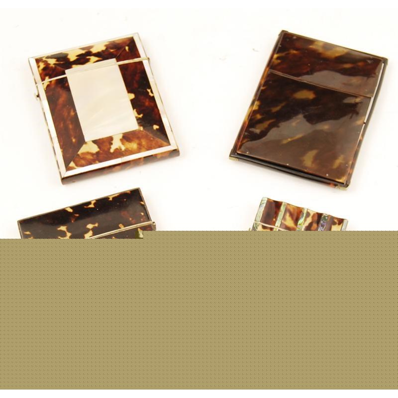 A Victorian tortoiseshell and mother of pearl card case, with hinged cover, 4in (10cm) h, another tortoiseshell example with inset inscribed plaque, another with fluted sides and abalone and a centrally hinged tortoiseshell card case. (4)