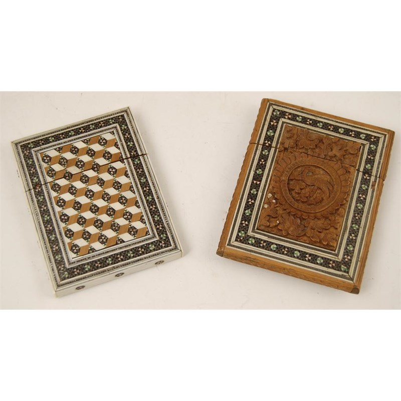 An Anglo-Indian sadeli work card case, with lift-off cover and sandal wood lined, 4in (10cm) h, and another with carved floral and bird panels. (2)