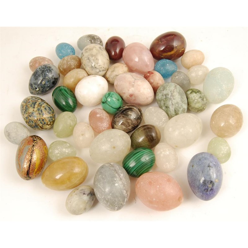 A quantity of specimen hardstone eggs, including: jasper and malachite, of varying sizes. (a lot)