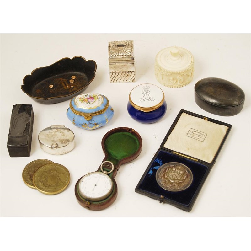 A 19th century turned and carved ivory circular box and cover, with a band in relief of rural figures and an urn finial, 2.25in (5.5cm) h, a papier mache pin tray, an inlaid oval pewter box and cover, a pocket aneroid barometer, 1.5in (4cm) dia., a silver coloured metal box containing miniature playing cards, a late Victorian Boxing medallion, two porcelain boxes, an oval metal box, a print block of a pointing finger and two reproduction medallions.