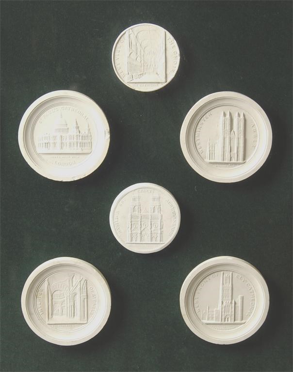 Six architectural plaster medallions, depicting: 'Westminster Abbey', 'St. Pauls Cathedral', two views 'Ely Cathedral' and 'Basilica SS. Crulis Aurelianensis', three after J. Davis, Birmingham, within a carved gilt surround and a glazed ebonised frame, 21.5 x 18.25in (54.4 x 46.6cm).