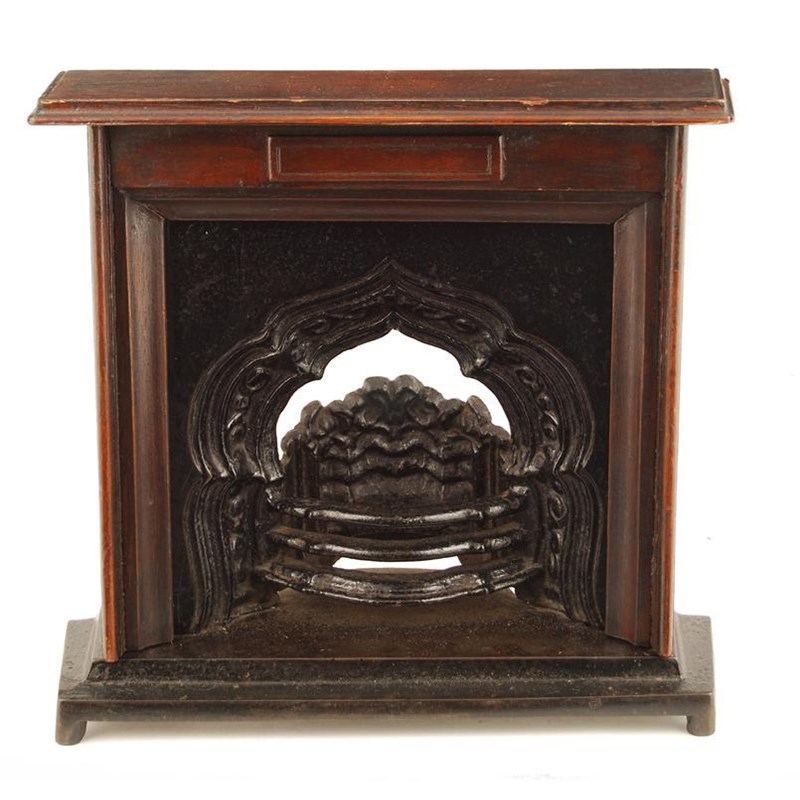 A Victorian cast iron miniature fireplace, with a mihrab design surround and a scroll fireback with a bar front, on a stepped bases, 9.75in (25cm) h, 12in (30.5cm) w, with a later mahogany surround.