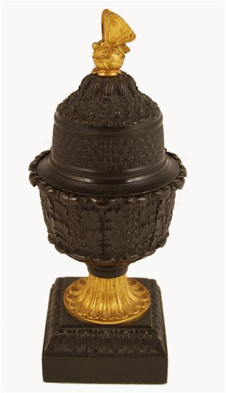 A bronze and ormolu bell urn, with leaf and floral decoration having a butterfly finial, with clapper, 6.75in (17cm) h.