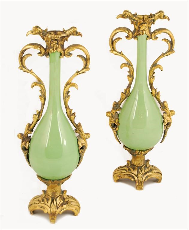A pair of late 19th century ormolu mounted ceramic vases, of bulbous form with slender necks, 10.75in (27.5cm) h. (2) One restored.
