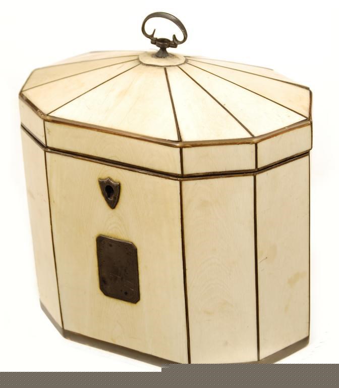 A George III ivory decagonal tea caddy, with horn stringing and banding, the hinged tent cover with loop handle, the front with a shield escutcheon and vacant applied plaque, with a plain interior having traces of foil, 5.25in (13.5cm) h, 5in (13cm) w.