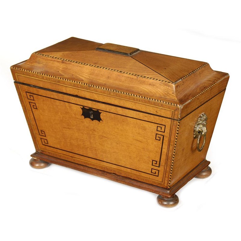 An early 19th century satinwood sarcophagus shape tea chest, with chequer and line stringing, the faceted and moulded hinged cover to a central bowl aperture flanked by a pair of lidded compartments, the front banded in kingwood with a key design, brass lion mask ring handles on turned feet, 8.5in (21.5cm) h, 12in (30.5cm) w, 6.25in (16cm) d.