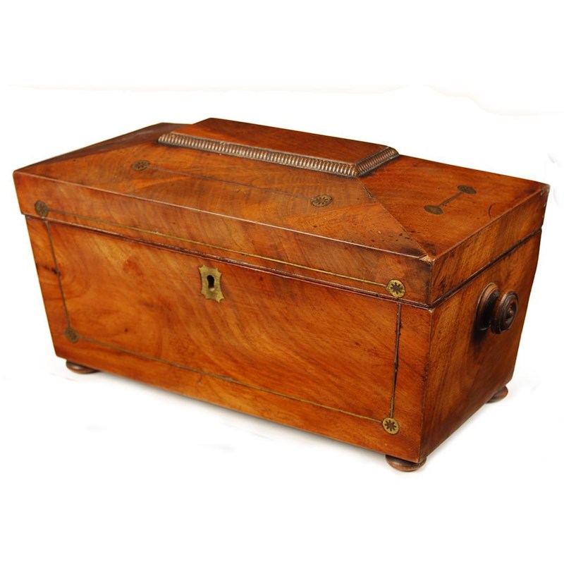 A William IV mahogany and brass inlaid sarcophagus shape tea caddy, the interior with two later lidded compartments flanking a later glass bowl, 6.75in (17cm) h, 13in (33cm) w. One piece of stringing missing, repairs around right hinge.