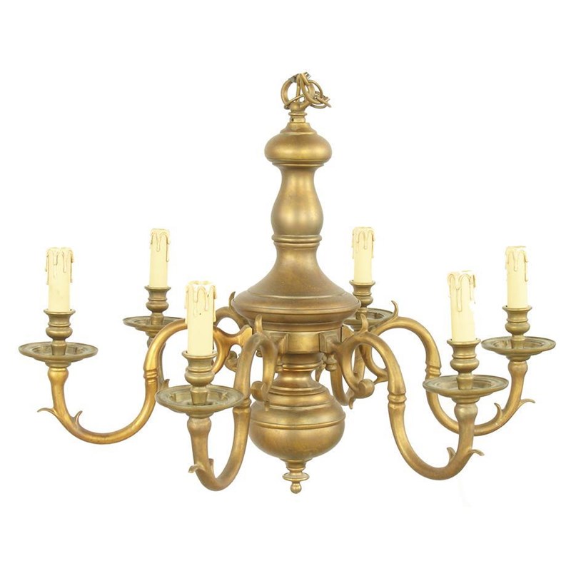 A gilt brass six branch electrolier, the turned stem issuing scroll arms with turned holders and faux candle electric fittings, 22in (56cm) h, 28.5in (73cm) w.