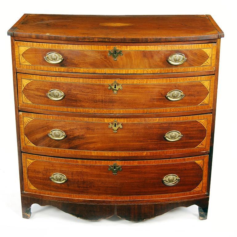 An early 19th century mahogany bowfront chest, with satinwood banding and later marquetry inlay, the top centred a conch shell above four graduated drawers fitted replaced brass escutcheons and handles, a shaped apron to cut out front feet, 37.25in (94.6cm) h, 37.75in (95.7cm) w, 20.5in (52cm) d. Losses to banding, feet with damages and replacements.