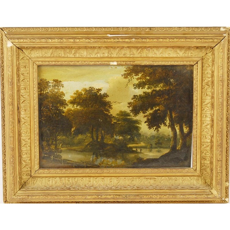 English School, 19th century. Figures fishing on a lake, oil on panel, 6.25 x 8.75in (16 x 22cm).
