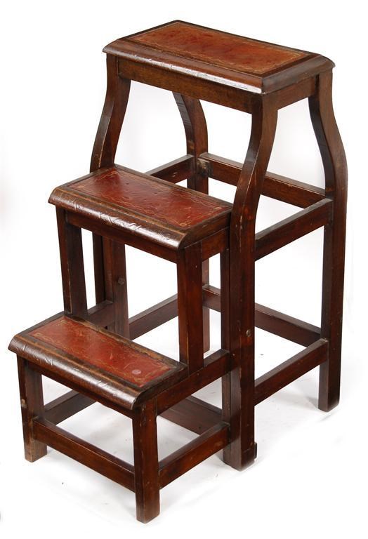 A set of mahogany folding library steps, with gilt tooled leather inset treads, 27.25in (69cm) h, 14in (35.5cm) w.