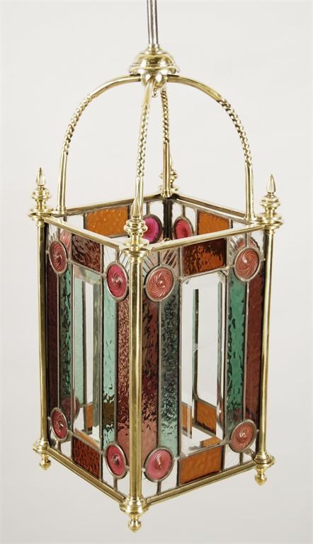 A Victorian brass hall lantern, with leaded stained glass panels, and faceted pointed finials with part spiral ribbed scroll supports with iron stem, previously for gas, 41.25in (104.5cm) h, 10.5in (26.5cm) w.