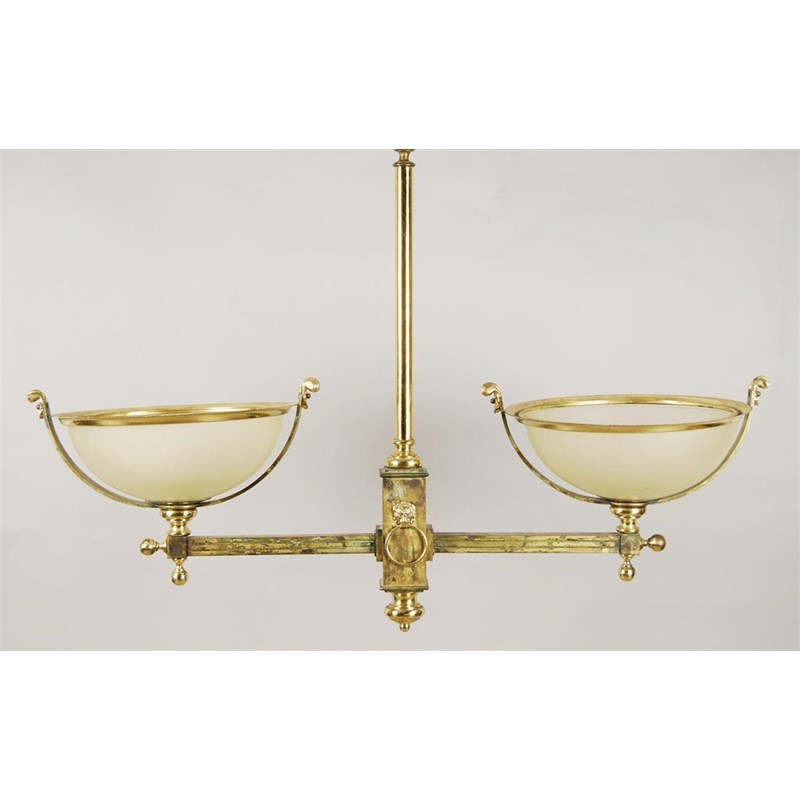 A brass twin light electrolier, the turned stem to lion's mask mounts and two frosted glass shades, 29in (73.6cm) h, 24in (61cm) w.