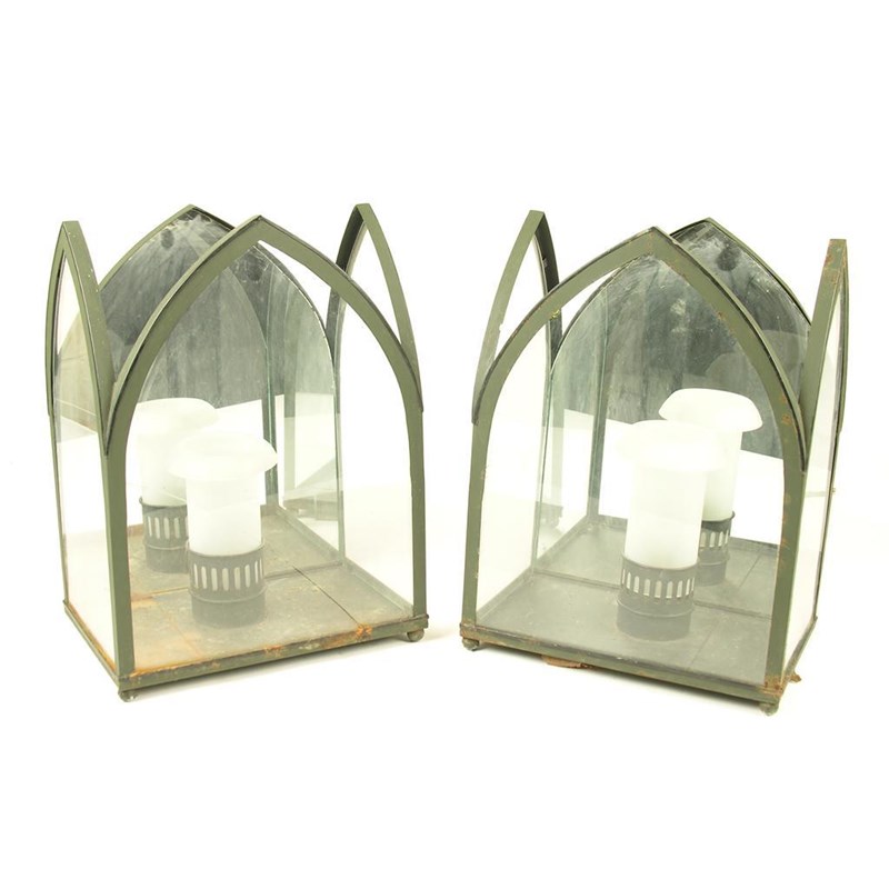 A pair of glass and painted metal wall lights, with mirrored backs, fitted for electricity, modern, made by Sperring & Best, West Street, London, W.1. 15in (38cm) h, 10.5in (27.2cm) w, 7.5in (18.5cm) d. (2) One glass panel cracked.