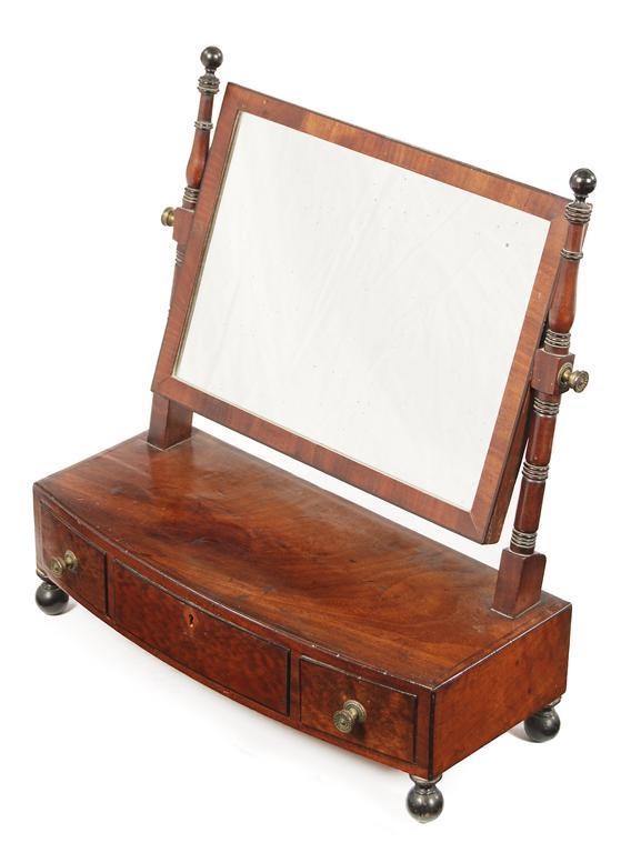 An early 19th century mahogany and inlaid swing frame toilet mirror, the rectangular plate supported by ring turned uprights, the bowfront base fitted three drawers, on ebonised ball feet, 19.5in (49.5cm) h, 18.25in (46.7cm) w, 8.5in (21cm) d. Lock replaced, later escutcheon.
