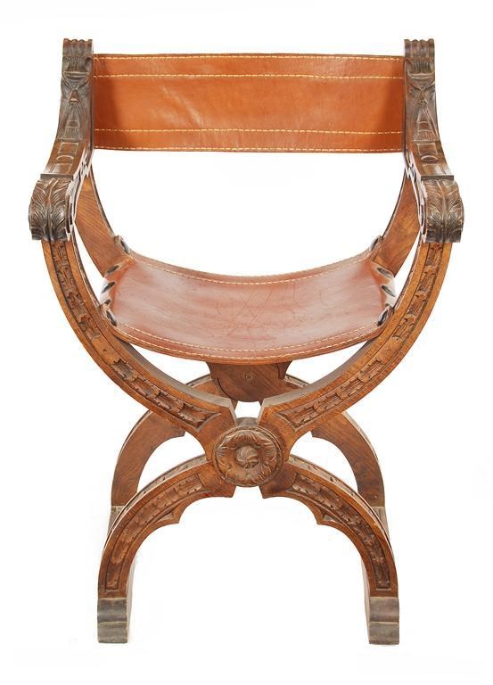 A continental carved beechwood folding 'X' frame chair, with studded leather back and seat.