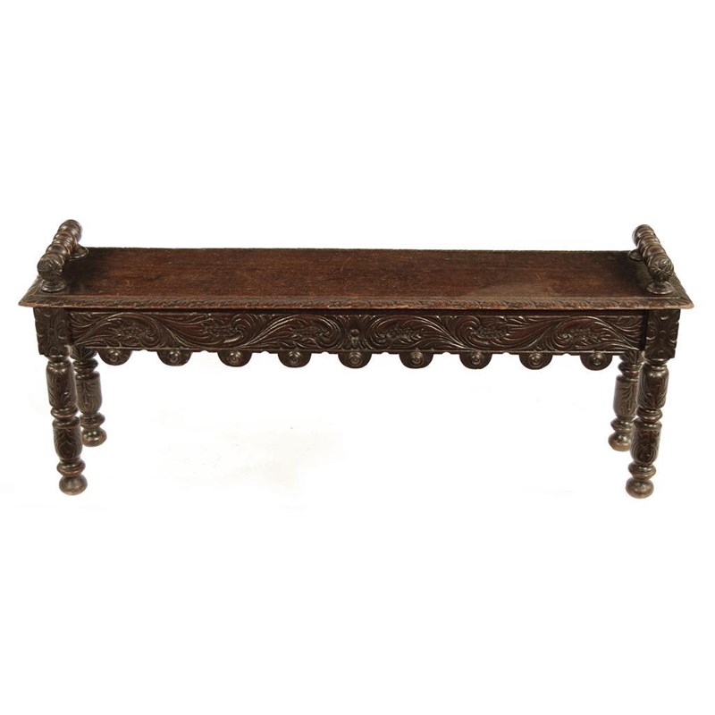 A carved oak hall bench, with turned bolster lifts to a foliage decorated frieze with applied rondels, on turned foliage carved legs, 19.5in (49.5cm) h, 48in (122cm) w, 11.25in (28.5cm) d.