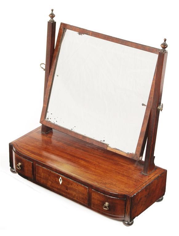 A 19th century mahogany and inlaid swing frame toilet mirror, the rectangular plate supported by reeded uprights with turned finials, the barrel front base fitted three drawers on bun feet, 20.25in (51.3cm) h, 18.75in (47.6cm) w, 8.25in (21cm) d. Veneer loss, damage and repair to back of frame.