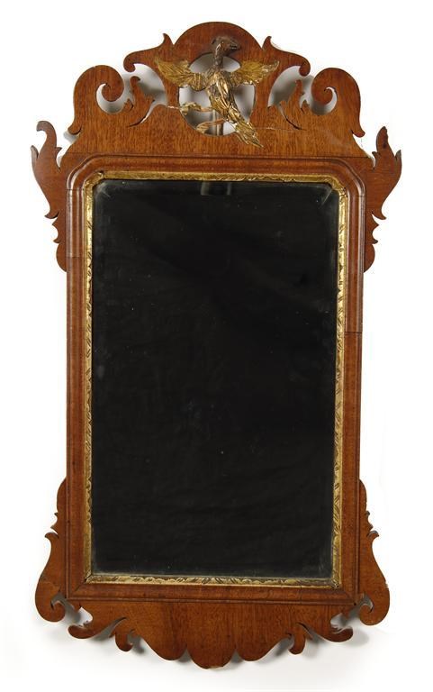 A George III style mahogany and parcel gilt fret frame wall mirror, with a carved ho-ho bird surmount, the bevelled plate to a gilt slip, 25.5in (65cm) h, 14.5in (36.8cm) w. Veneer loss, cracks and losses to surmount.