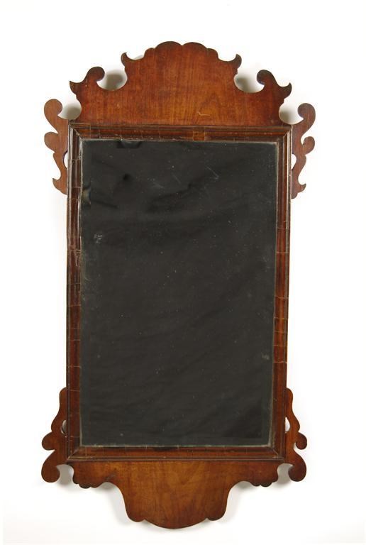A mid 18th century walnut fret-frame wall mirror, the replaced bevelled plate to a moulded edge, 32.25in (82cm) h, 17.75in (44.9cm) w. Replacements to ears and veneers