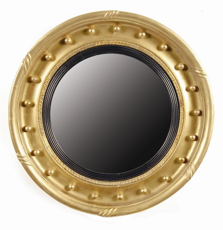 An early 19th century giltwood and gesso convex wall mirror, with an ebonised reeded slip and applied ball border, 23.75in (60.2cm) dia. Re-gilt.