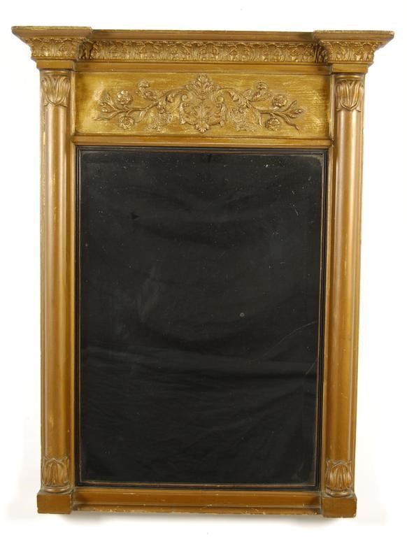 A Victorian giltwood and gesso pier mirror, the inverted breakfront and leaf moulded cornice above a scrolling foliage frieze and a rectangular bevelled plate with ebonised slip flanked by leaf capped pilasters, the reverse with printed label for 'Fraser & Brown Carvers and Gilders', 34.75 x 26.25in (88.5 x 67cm).