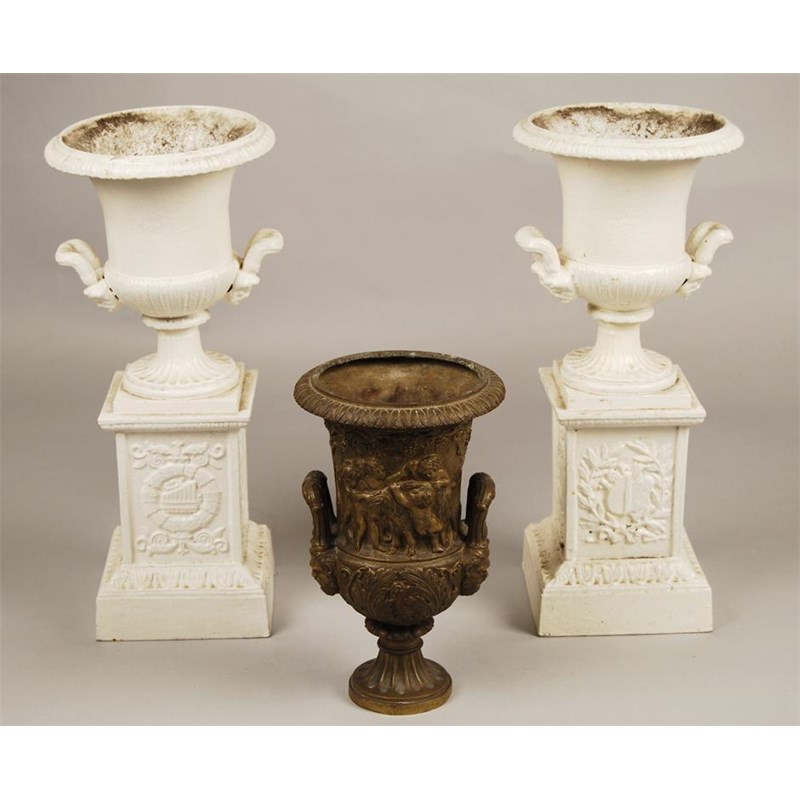 A pair of late 19th century French cast iron urns, later painted, of campana form on square plinths decorated musical and artistic trophies, 13.5in (34cm) h, and a brass vase decorated bacchanalian scenes. (3)