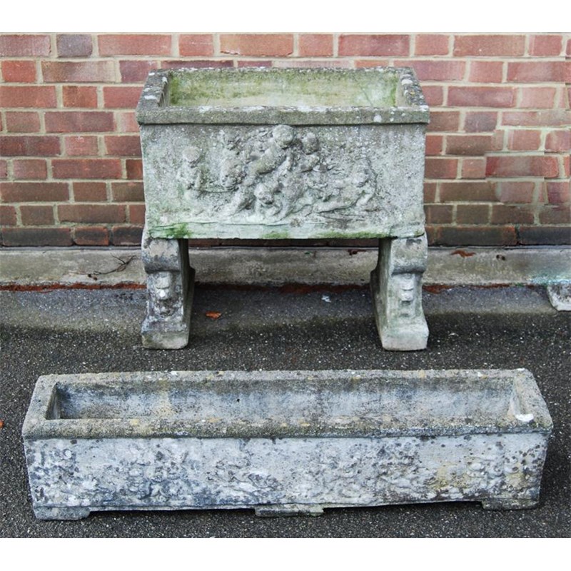 A reconstituted stone rectangular jardiniere, leaf decorated bacchanalian scenes, on a pair of trestle ends with lion masks, 26.75in (68cm) h, 28.25in (71.5cm) w, and another rectangular planter with classical hunting scenes. (4)