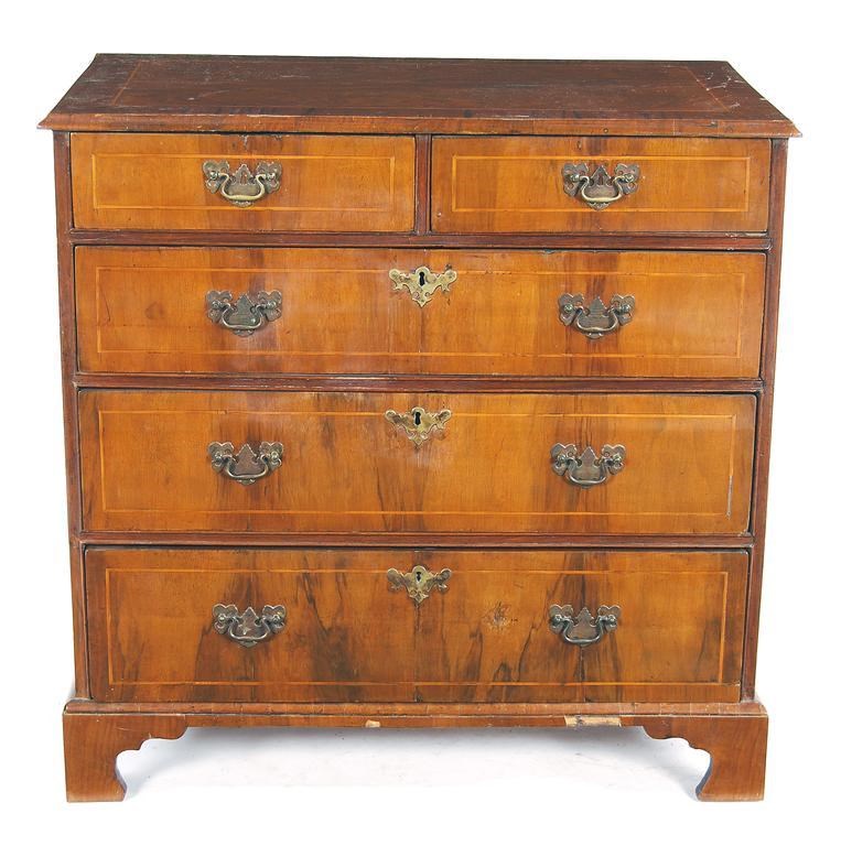 A walnut veneered chest, with crossbanding and stringing with two short and three long graduated drawers fitted brass handles on bracket feet, 18th century with re-veneering, 34in (86.5cm) h, 34.25in (87cm) w, 19.75in (50cm) d.