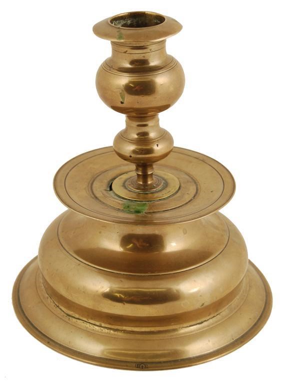 A mid to late 17th century Scandanavian candlestick, with a bulbous knopped sconce and a drip pan with a compressed flared base, stamped 'HB' with horseshoe, 7.25in (18.5cm) h. Rim repaired with minor loss, strengthening sleeve to inner edge of foot.