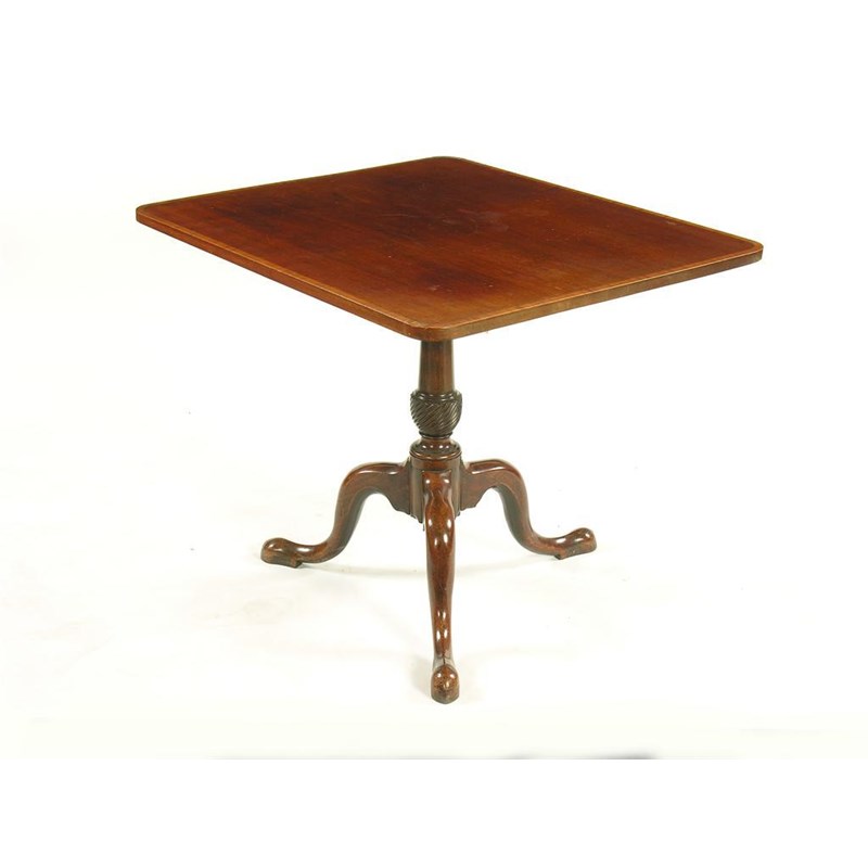 A George III mahogany tripod table, the later rectangular tilt top satinwood banded revolving on a birdcage to a turned and spiral fluted bowl, 28.75in (73cm) h, 33.5in (85cm) w, 29.5in (75cm) d.